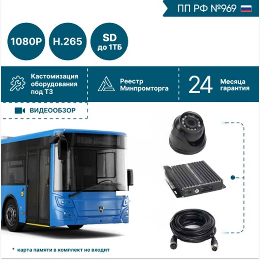 Комплект NSCAR BUS301: 3 камеры FullHD с 2 SD-картами для общественного транспорта. Контроль салона и дороги. Надежная запись 24/7